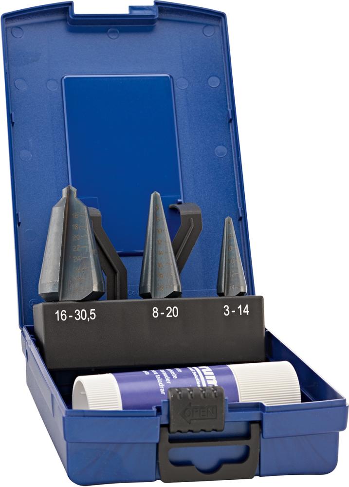 Lieferung: In Kunststoffkassette mit automatischer Aufrichtfunktion der Blechschälbohrer beim Öffnen, inklusive einer Tube Bohrpaste.