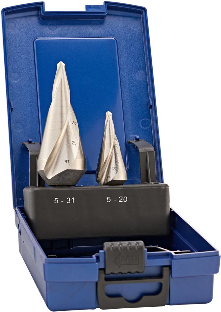 Lieferung: In Kunststoffkassette mit automatischer Aufrichtfunktion der Blechschälbohrer beim Öffnen.