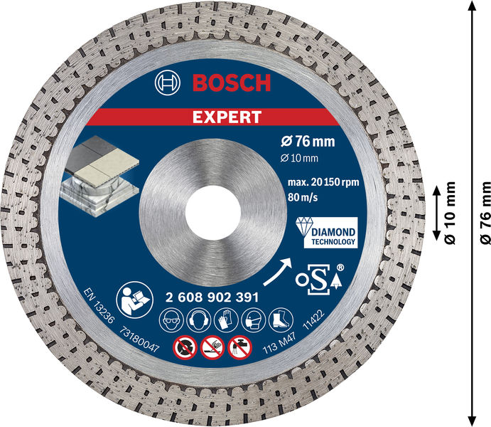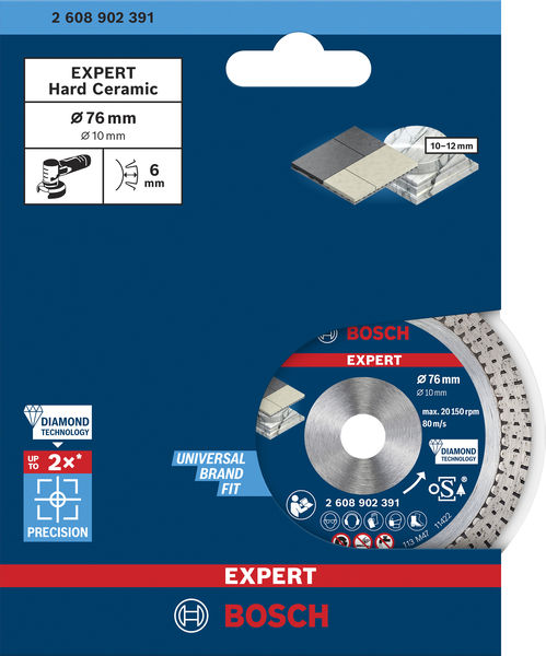 Hochpräzises Schneiden von Hartkeramikfliesen! Spanfreies Schneiden mit einem speziell entwickelten durchgehenden Rand Die in modernen Baustellen verwendeten Fliesen sind häufig groß, sehr hart und teuer. Es ist daher sehr wichtig, sie jedes Mal perfekt zu schneiden – auch wenn dies schwierig ist. EXPERT Hard Ceramic verwendet Diamond Technology und eine Reihe von Konstruktionsmerkmalen, um selbst in den härtesten Keramiken konstant beste Ergebnisse zu erzielen. Der Bosch EXPERT Hard Ceramic bietet den besten Schnitt in harte Fliesen. Mit dieser Diamanttrennscheibe erreichst du bei allen Arbeiten ein professionelles Finish. Saubere, hochwertige Schnitte mit Bosch Diamond Technology