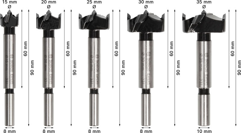 Überragende Lebensdauer beim Bohren in Schichtholz! Feingeschliffene, scharfe Hochleistungs-Carbide-Spitze Die Montage von Scharnieren erfordert sauber gesetzte Bohrungen, für die wiederum ein Scharnierbohrer benötigt wird, der lange seine Schärfe hält und perfekte Bohrungen ohne Splitter ermöglicht. Dafür haben wir das Set EXPERT Laminated Wood entwickelt – unsere außergewöhnlich langlebigen Scharnierbohrer, mit denen sich saubere und präzise Löcher in Schichtholz und Sperrholz bohren lassen. Ob saubere, splitterfreie Löcher für Türscharniere, Senkbohrungen oder andere Arten von Bohrungen in Holz, mit den Bohrern aus dem Set EXPERT Laminated Wood und seinen scharfen Carbide-Schneidkanten schaffst du jede Arbeit mit Leichtigkeit. Die Bohrer sind für den Einsatz an Stationärmaschinen entwickelt. Überragende Lebensdauer dank Bosch Carbide Technology