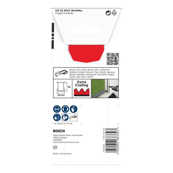 Lange Lebensdauer beim Schneiden von Holz mit Nägeln und abrasiven Materialien! Zusätzliche Beschichtung macht Carbide härter Ein Blatt für Multifunktionswerkzeuge, mit dem du hervorragende Schnitte in verschiedensten Materialien machen kannst, erleichtert das Arbeiten erheblich. Darum haben wir das EXPERT AIZ 32 APILT MultiMax-Tauchsägeblatt entwickelt. Mit ihm kannst du präzise Schnitte und Tauchschnitte in Holz mit Nägeln, Ziegelstein und andere Verbundwerkstoffe und abrasive Materialien machen – effizient und mühelos. Das dünne, lange Blatt des EXPERT AIZ 32 APILT MultiMax-Blatts ist außergewöhnlich langlebig und ermöglicht Tauchschnitte mit einer Tiefe von bis zu 45 mm. Die konischen Carbide-Zähne mit dem innovativen Curved-Tec-Profil sind robust und scharf. Sie sind dafür ausgelegt, Späne effizient zu entfernen und Hitzeverfärbungen zu reduzieren – insbesondere beim Schneiden in Holz. Überragende Lebensdauer dank Bosch Carbide Technology
