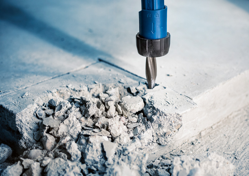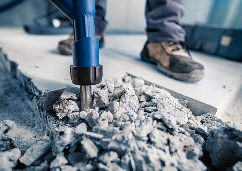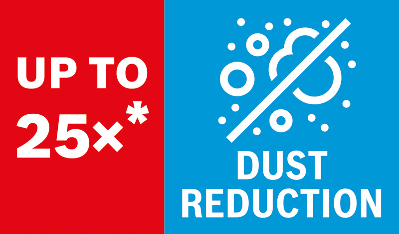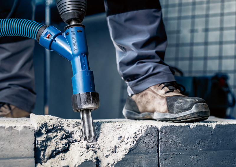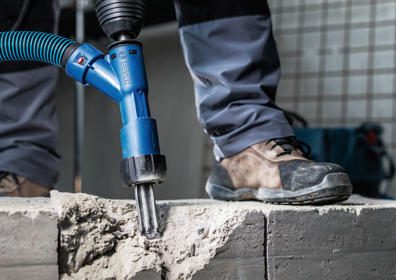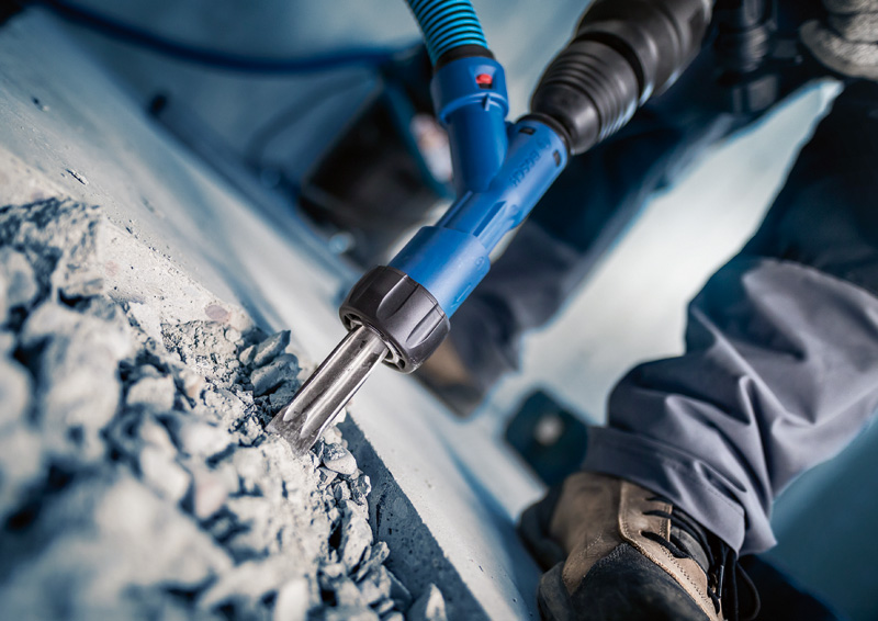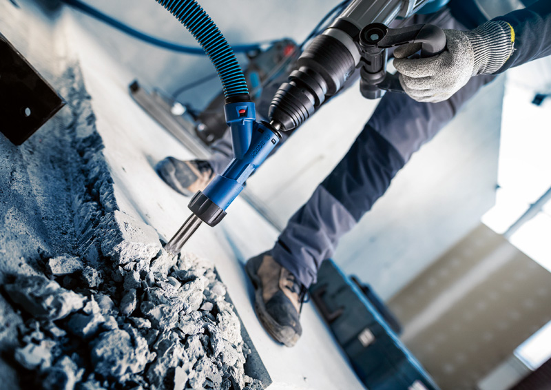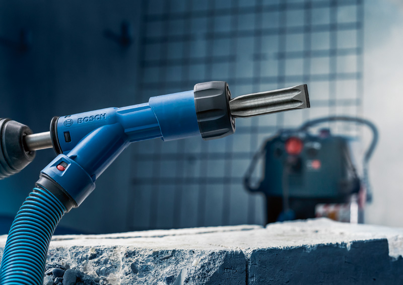 Verbesserte Staubreduzierung beim Aufbrechen von Beton! Das RTec-Element sorgt für einen höheren Materialabtrag Bei Betonabbrucharbeiten entsteht nicht nur viel Betonschutt, auch die Atemluft am Arbeitsplatz wird mit Staub belastet. Wie wäre es, wenn du den Staub einfacher loswerden könntest? Wir haben das EXPERT SDS Clean Set for Chiselling entwickelt, damit die Umgebungsluft während der Arbeit möglichst sauber gehalten wird. Abbrucharbeiter, die SDS max Meißel zum Aufbrechen von Beton einsetzen und eine wirksame Lösung zur Staubabsaugung benötigen, profitieren vom EXPERT SDS Clean Set for Chiselling. Do kannst den Adapter mit dem RTec-Element für den Energiereflexionseffekt problemlos an selbstschärfenden Bosch SDS max Meißeln montieren und an einen Staubsauger anschließen, um die Staubbelastung am Arbeitsplatz zu minimieren. So kannst du die Arbeit effizient erledigen und ohne Unterbrechungen mit der nächsten Aufgabe fortfahren. Hocheffizienter Abtransport von Staub mit Bosch Particle Control