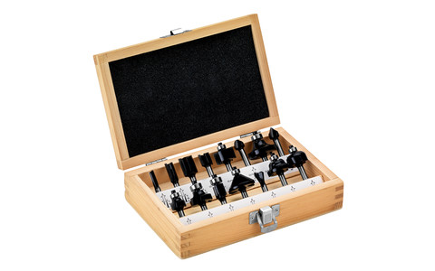Bestehend aus: 3 x Nutfräser: Ø 6 mm; 10 mm; 16 mm; 1 x Hohlkehlfräser: Ø 12,7 mm, R 6,35 mm; 1 x Fasefräser: Ø 32 mm; 45°; 1 x V-Nutfräser: Ø 12,7 mm; 90°; 3 x Abrundfräser: Ø 15,9 mm; R 3,2 mm; 25,4 mm; R 6,3 mm; 31,8 mm; R 9,5 mm; 1 x Bündigfräser: Ø 12,7 mm; 1 x Zinkenfräser: Ø 12,7 mm; 14°; 1 x Profilfräser: Ø 25,5 mm; R 4 mm; 1 x Falzfräser: Ø 22,2 mm; 1x Scharniernutfräser: Ø 12,7 mm; 1x Kantenformfräser: Ø 22,0 mm; R6,3 mm