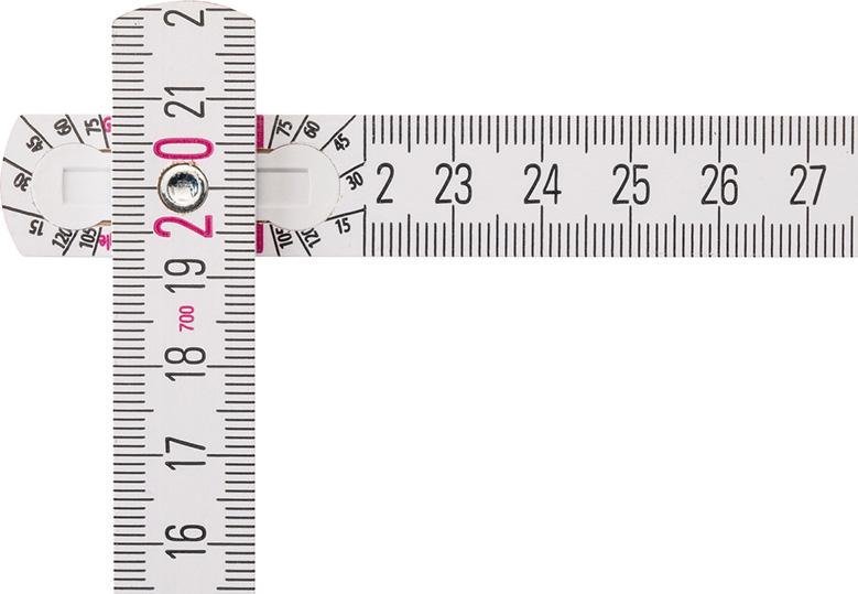 • Durch die eingelassenen Gelenke entsteht im ausgeklappten Zustand eine durchgehend gerade Kante, der Maßstab ist so auch als Lineal für eine durchgezogene Anreißlinie zu verwenden