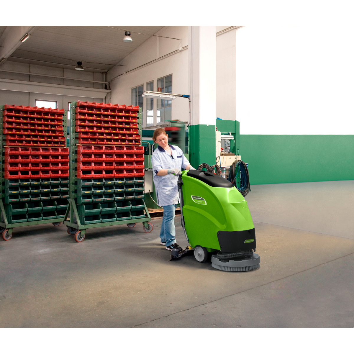 - Batteriebetriebene Scheuersaugmaschine mit halb-automatischem Antrieb, Scheibenbürste und Schmutzwasserabsaugung