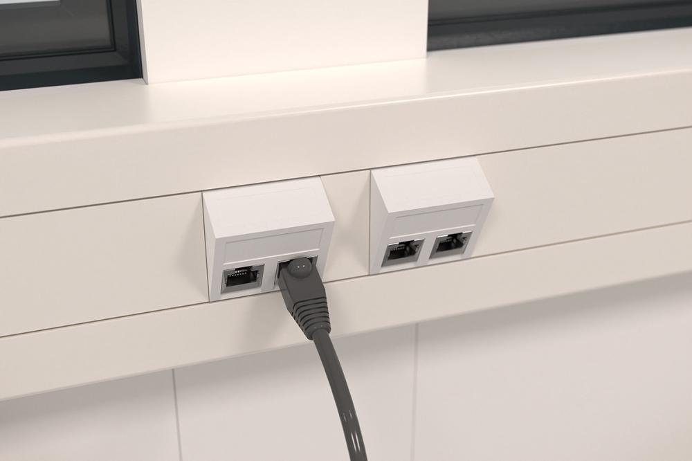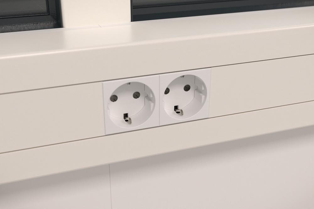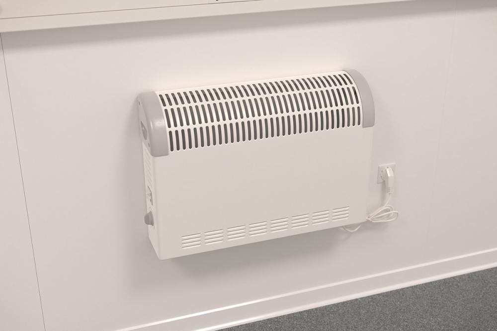 1 LED-Deckenunterbauleuchte, 1 Netzwerkdose, 2x Zweifach-Steckdosen, 3-reihig bestückbar mit max. 36 Automaten, Elektrowandkonvektor 1 x 2 kw mit stufenlosem Temperaturwähler und Thermostat