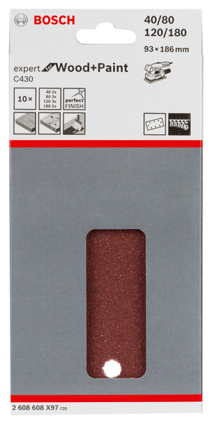 Schleifblatt C430, 93 x 186 mm, 2x40, 3x80, 3x120, 2x180, 8 Löcher, 10er-Pack