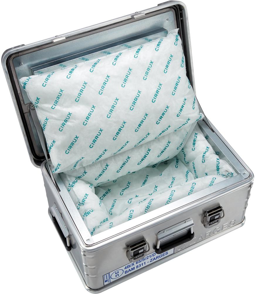 • Spezialbehälter aus Aluminium • Hohe Stabilität durch 3 vollverschweißte Aluprofilrahmen • Einsatz: für die sichere Aufbewahrung und den Transport von defekten oder beschädigten Lithium-Batterien (gemäß ADR SV 376, P908) • Festlegung auch für kritisch defekte Lithium-Batterien nach P911 vorhanden • Mit feuerfestem Polster- und Aufsaugmaterial aus textuierten Glasfasern • Staubfreie Innenausstattung • Vorschriftsgemäßer öffentlicher Transport möglich • Nach UN-Bestimmungen als Gefahrgutverpackung geprüft und zugelassen • Zulassung für den Transport kritisch defekter Lithium-Batterien gemäß P911, SV 376 und Festlegung der Bundesanstalt für Materialforschung und -prüfung (BAM) – kann bei ZARGES angefordert werden • Temperatur an der Behälteroberfläche unter 100 °C • Max. Bruttomasse Gefahrgutzulassung: 65 kg Hinweis: Produkte mit Zulassung nach GGV können nicht zurückgenommen werden.