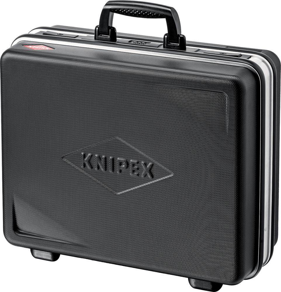 • Kofferschale aus ABS-Kunststoff, schwarz • Aluminiumrahmen • Deckelhalter mit Scharniermechanik • Dokumentenfach im Deckel • 2 herausnehmbare Werkzeugtafeln aus schmutzabweisenden PP-Hohlkammerplatten mit 21 Einsteckfächern • Bodenschale, 50 mm hoch, frei unterteilbar und mit Abdecktafel mit 12 großen Einsteckfächern und 1 Flachfach, per Druckknopf fixierbar • Beschriftungsfeld mit 2 Aufklebern zur individuellen Kennzeichnung • Ergonomischer Tragegriff • 2 Metall-Kippschlösser und 3-stelliges Zahlencodeschloss